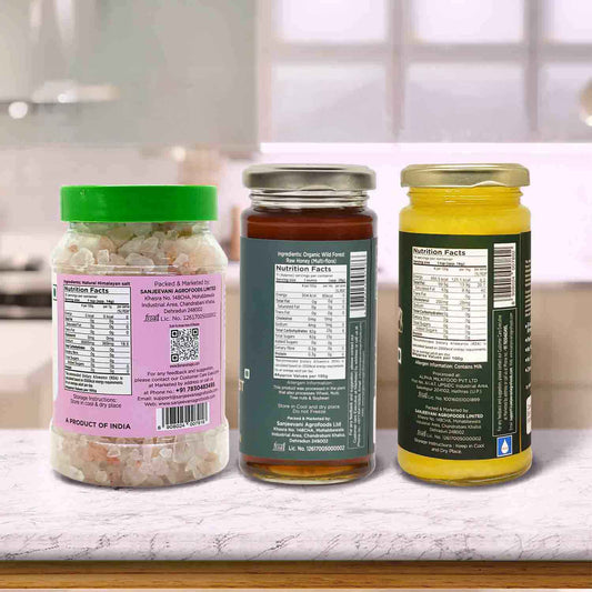 Organic A2 Badri Cow Ghee 200G x 1pc + Pink Salt Crystals 400G x 1pc + Organic Wild Forest Honey 300G x 1pc