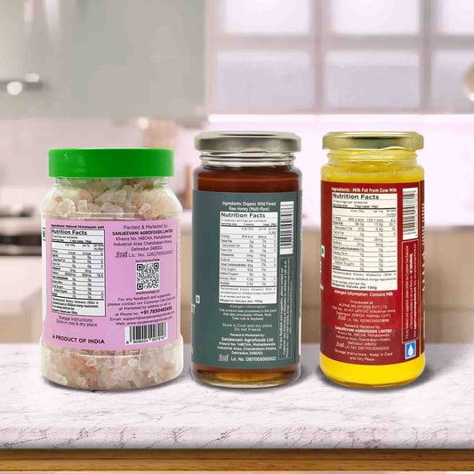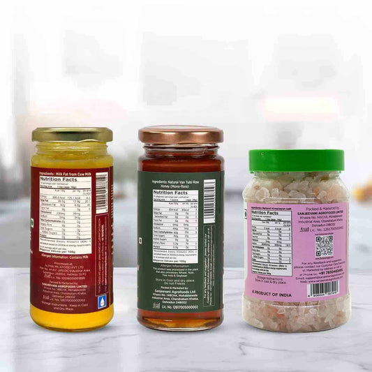 Organic Bilona Cow Ghee 200G x 1pc + Pink Salt Crystals 400G x 1pc + Natural Van Tulsi Honey 300G x 1pc