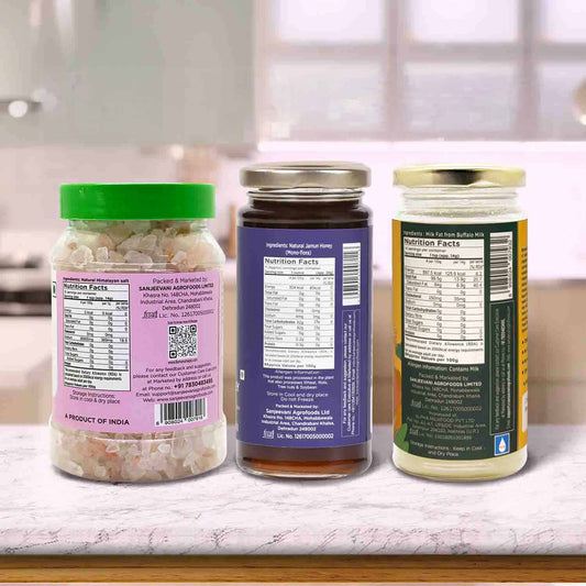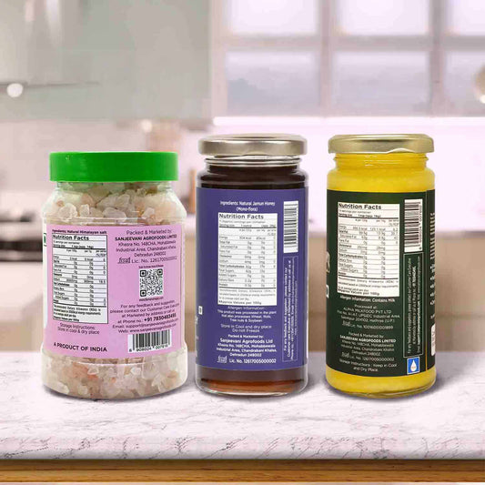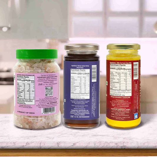 Organic Bilona Cow Ghee 200G x 1pc + Pink Salt Crystals 400G x 1pc + Natural Jamun Honey 300G x 1pc