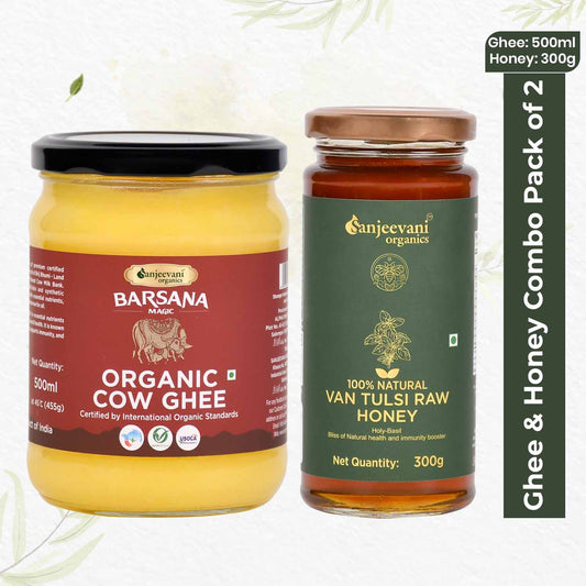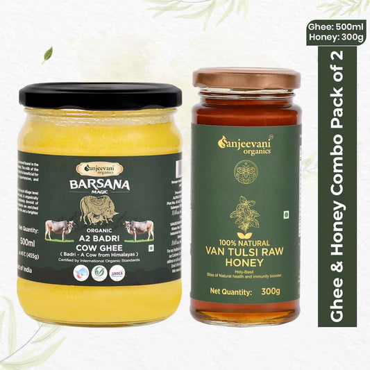 Organic Cow Ghee and Natural Van Tulsi Raw Honey (Pack of 2)